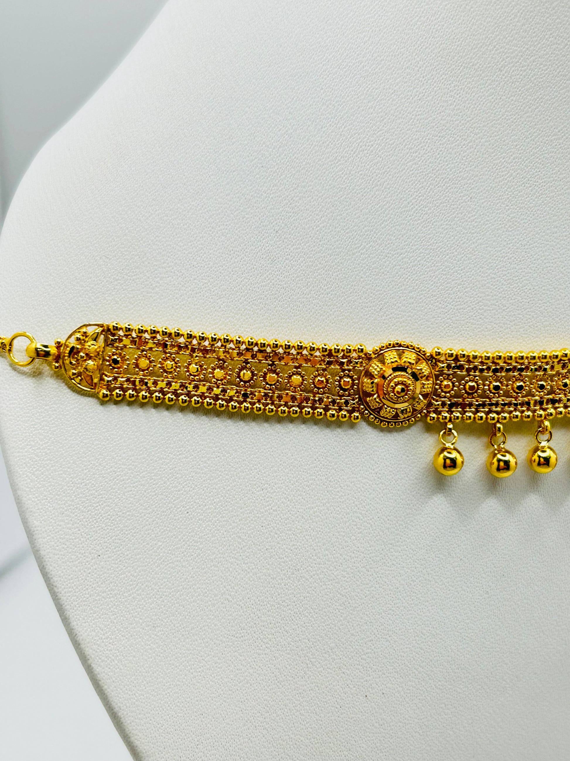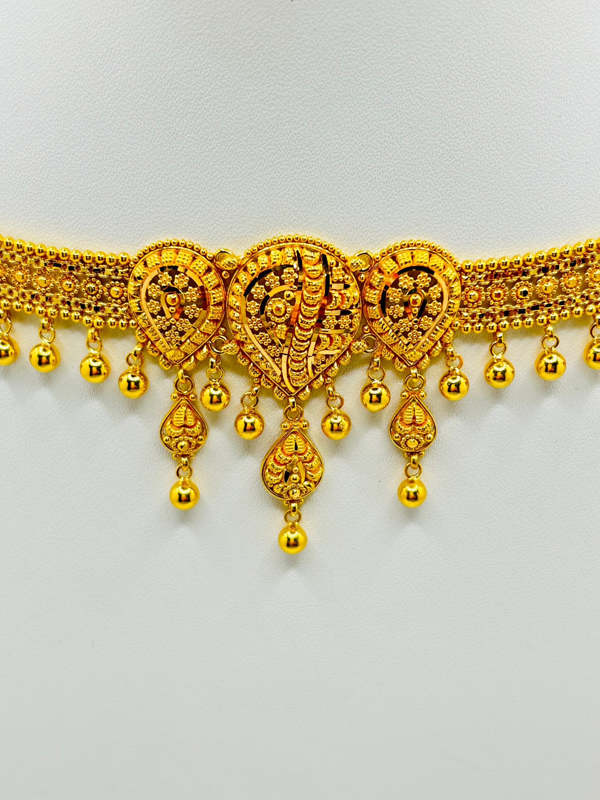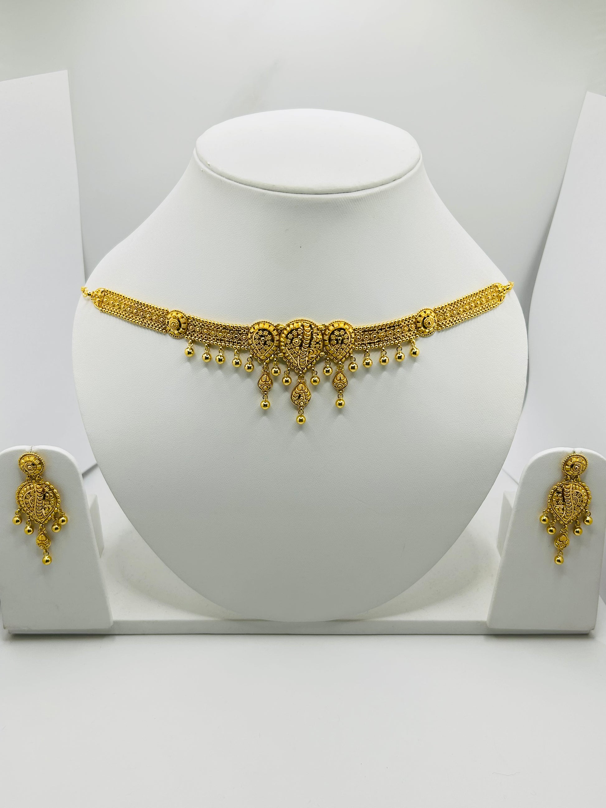 Bold, luxurious, and beautifully crafted, this exquisite 22ct gold bridal choker set includes a stunning choker-style necklace with matching earrings, designed to make a striking statement on your special day. Featuring a rich golden finish and elegant detailing, this set embodies traditional bridal luxury and timeless sophistication.