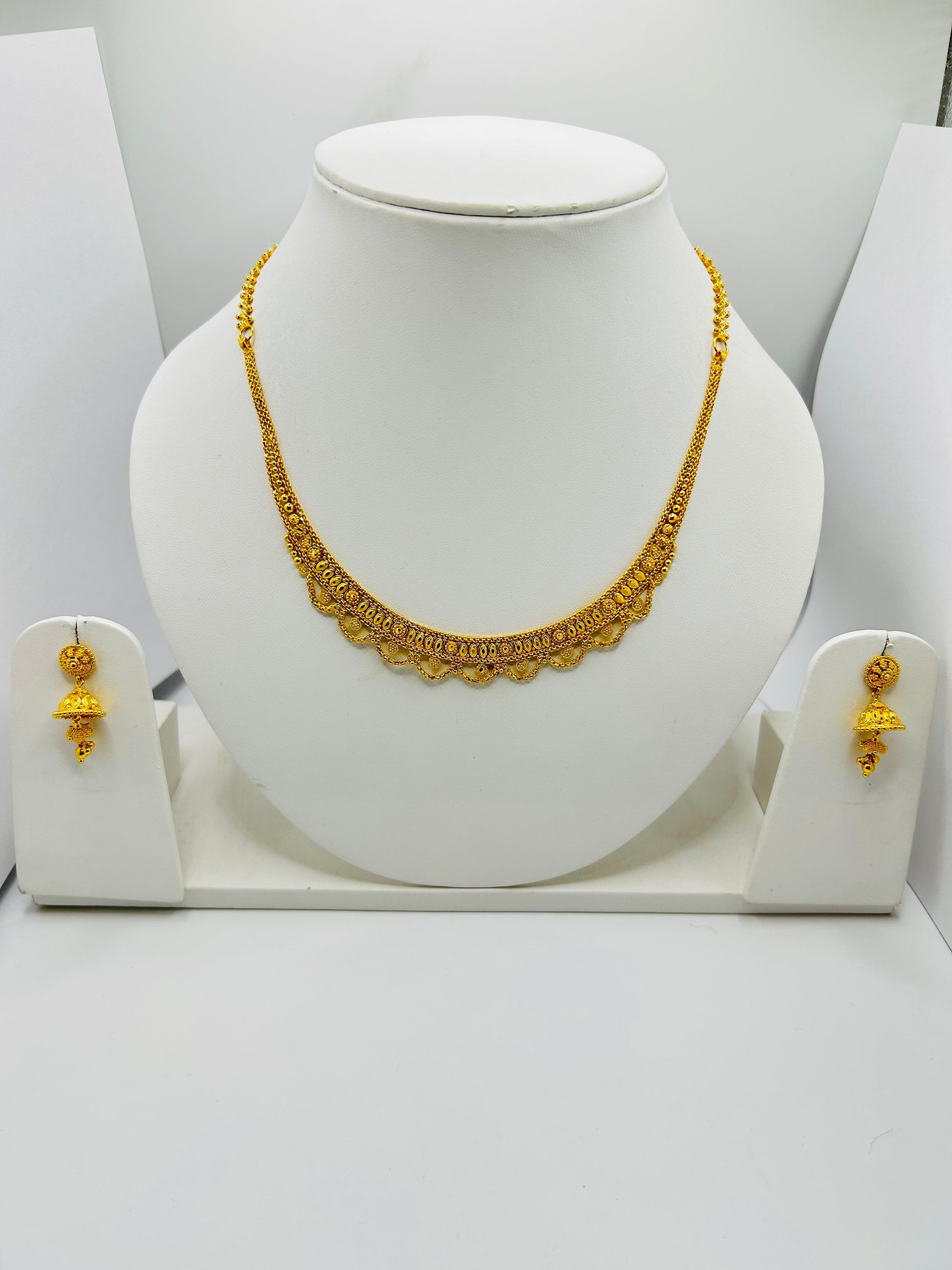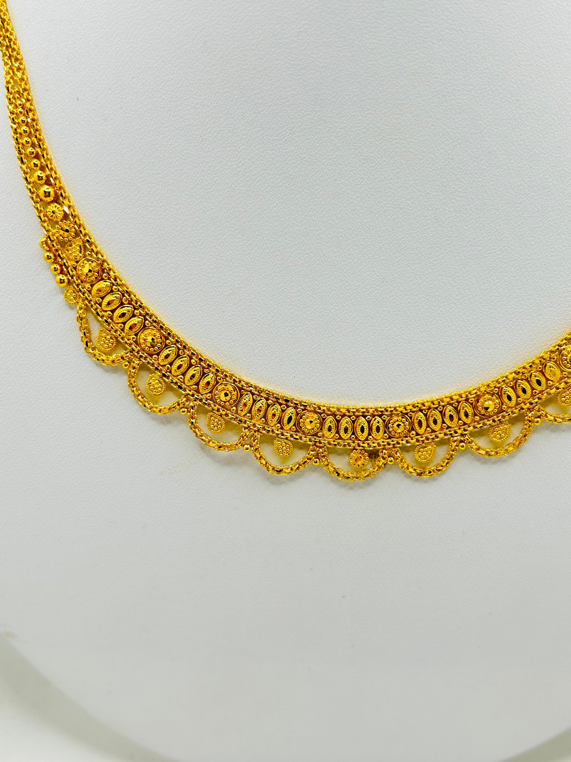 Elegant, traditional, and beautifully crafted, this stunning 22ct gold bridal set includes a matching necklace and earrings, designed to make a timeless statement on your special day. With a rich golden shine and refined detailing, this set reflects classic bridal elegance and luxury.