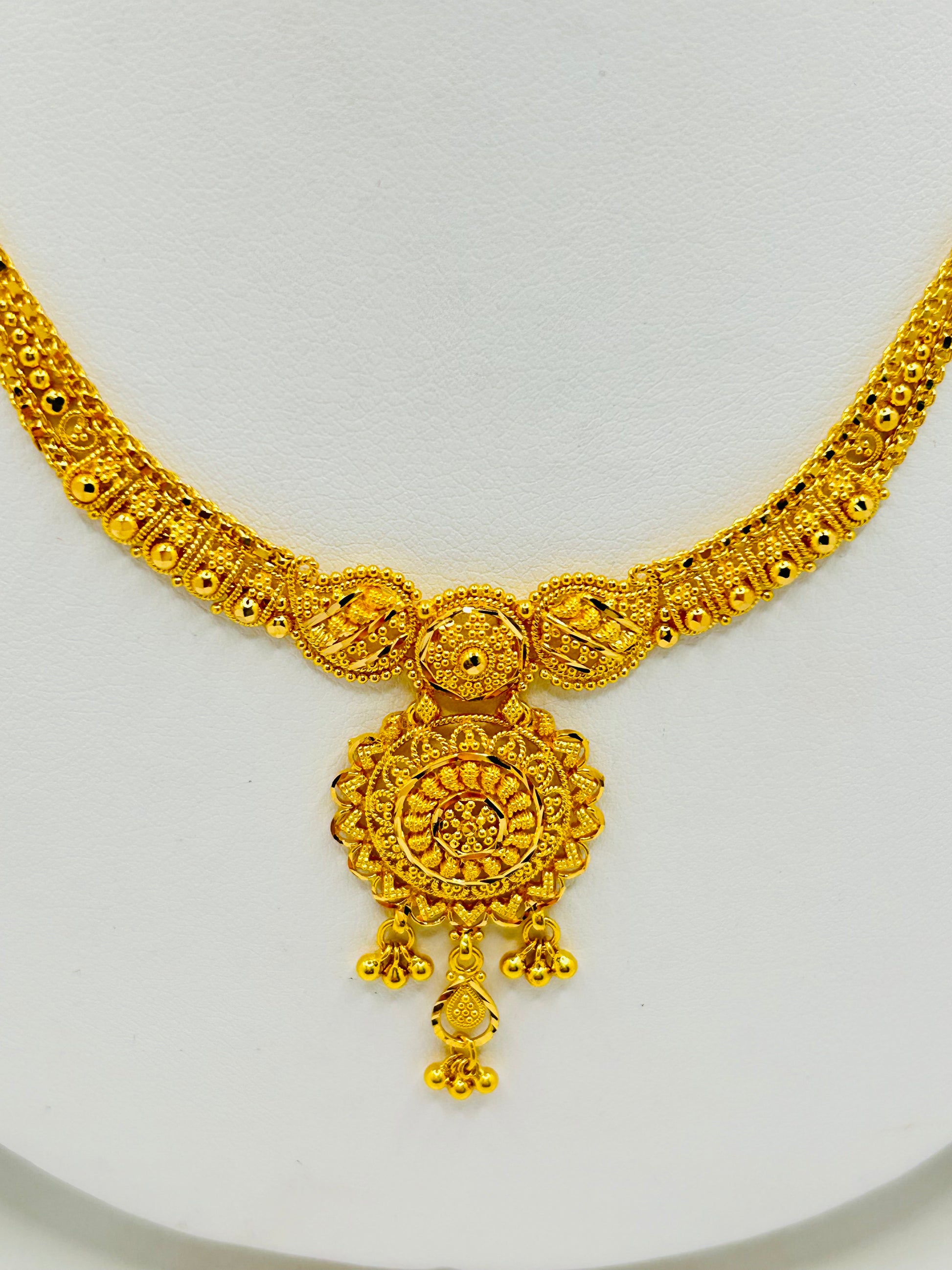 Elegant, traditional, and beautifully crafted, this stunning 22ct gold bridal set includes a matching necklace and earrings, designed to make a timeless statement on your special day. With a rich golden shine and fine detailing, this set reflects classic bridal elegance and luxury.